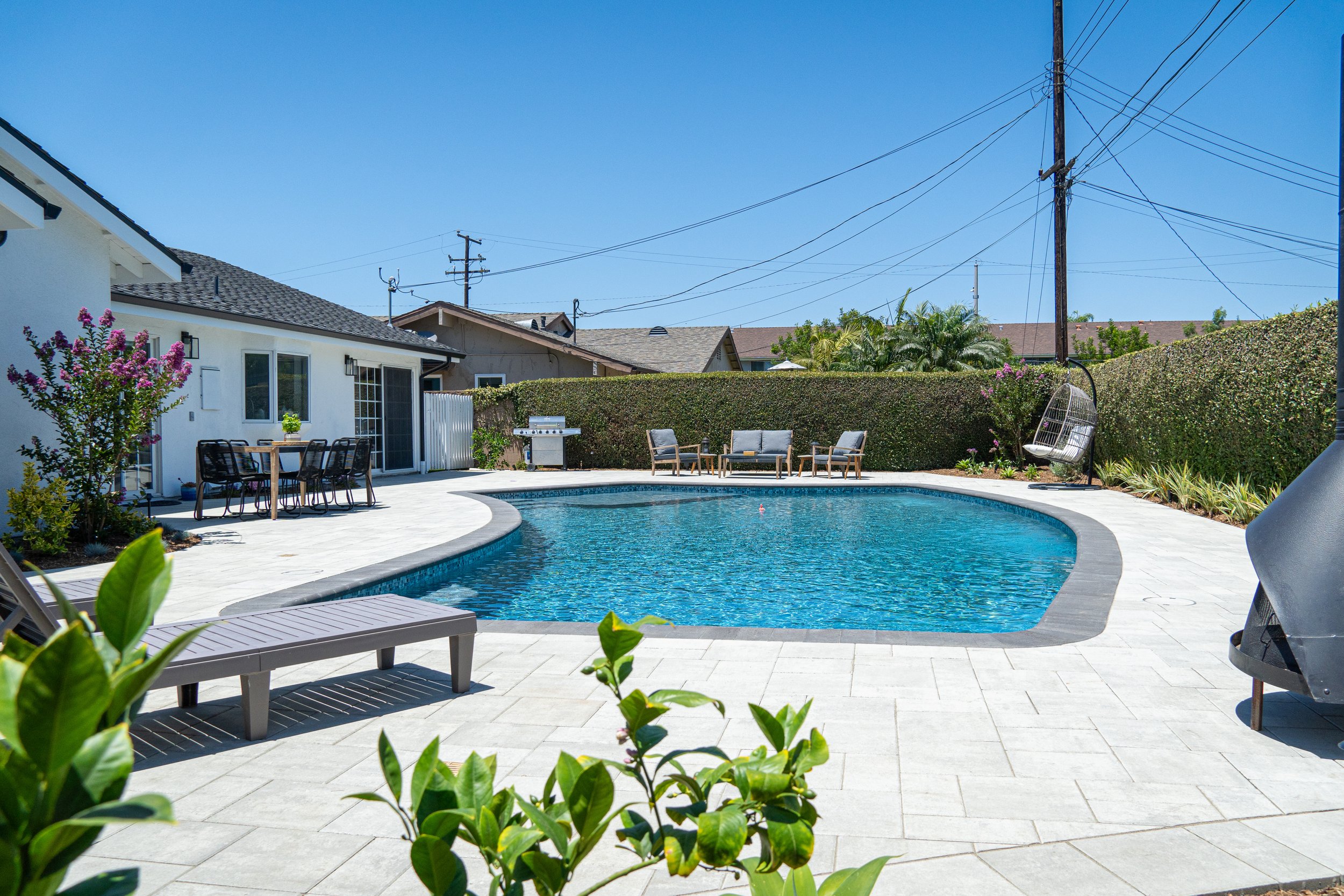 • Backyard with swimming pool, patio furniture, and lounge chair under a clear blue sky.